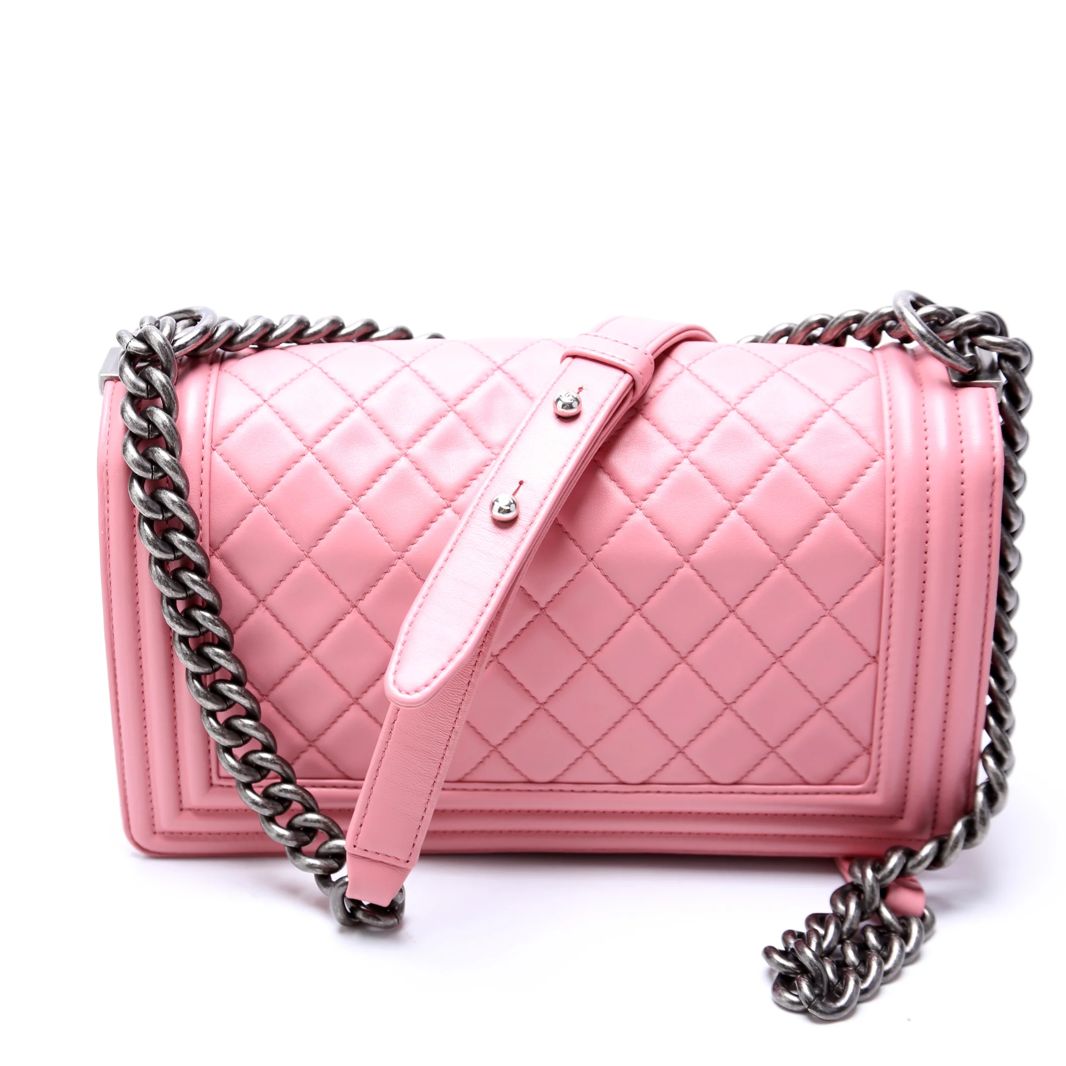 This pre-owned Chanel Boy Flap Medium Old Lambskin is guaranteed 100% authentic.Ā