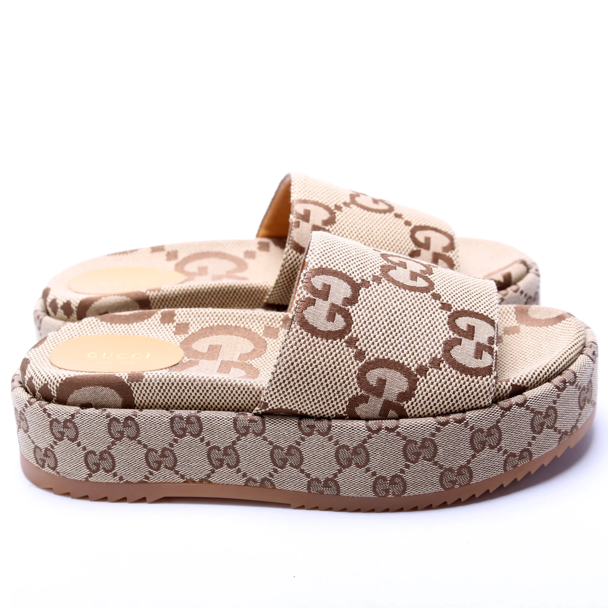 These pre-owned Gucci GG Maxi Canvas Platform Slides are guaranteed 100% authentic.