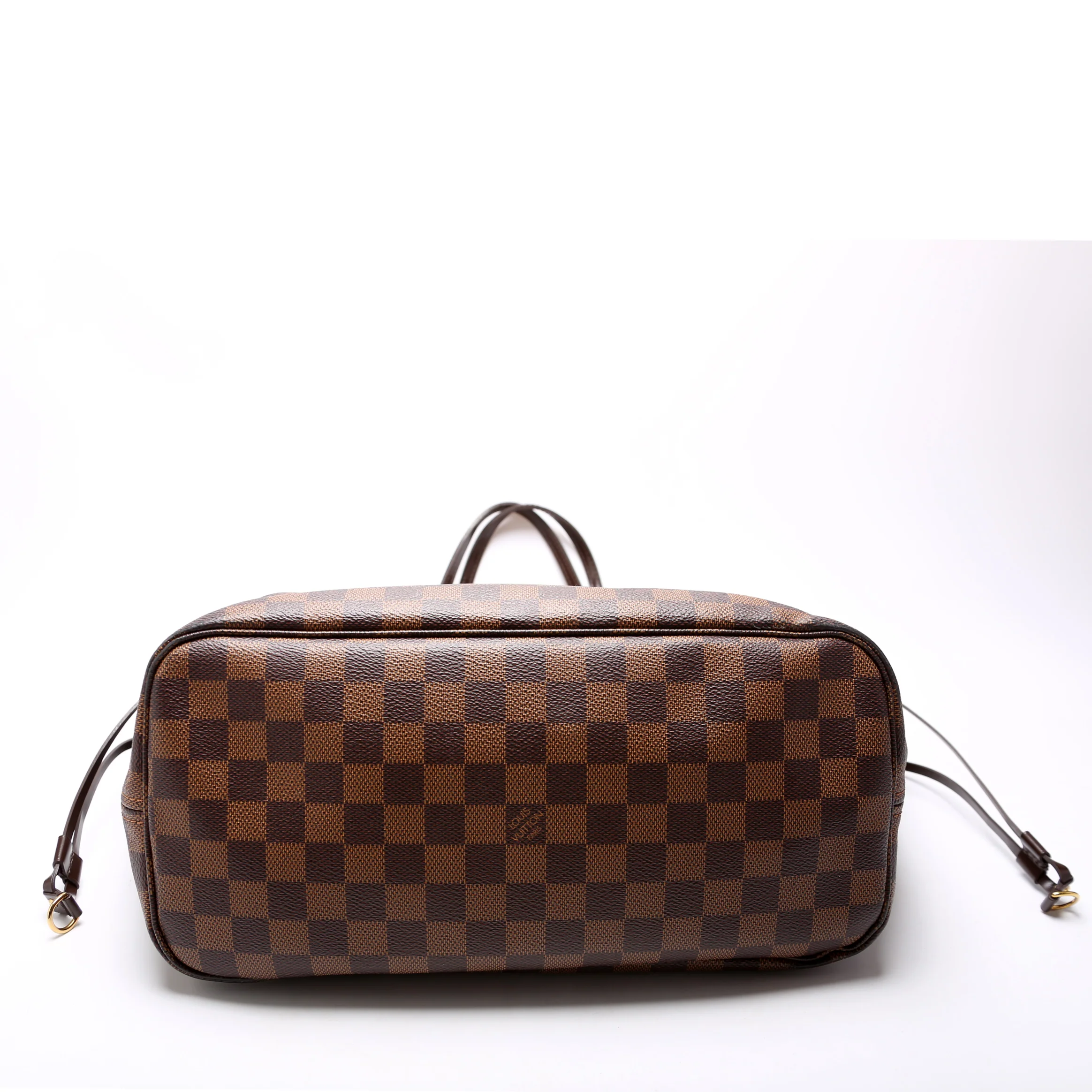 This pre-owned Louis Vuitton Neverfull MM is guaranteed 100% authentic. The exterior is in the classic Louis Vuitton Damier Ebene coated canvas.
