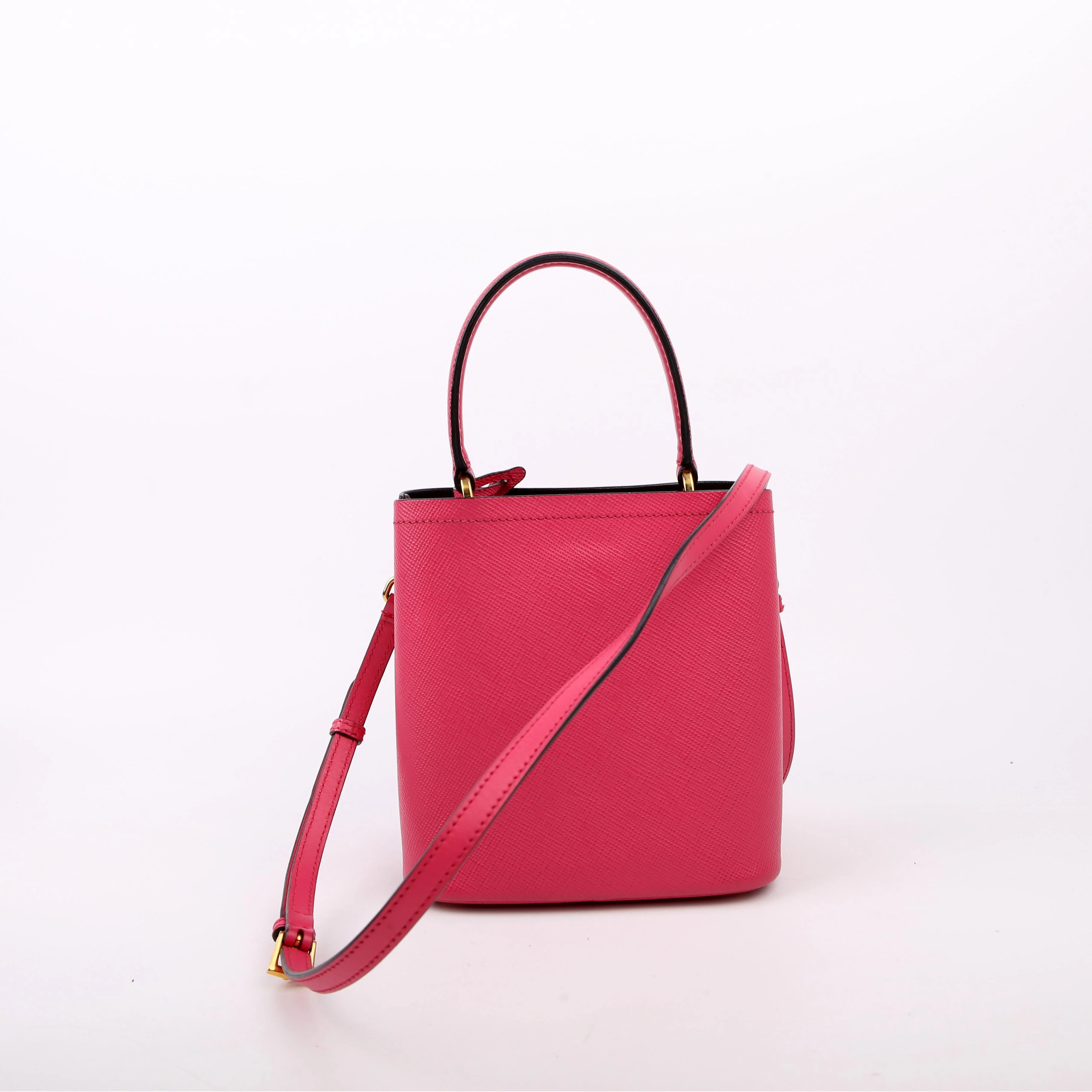 This pre-owned Prada Saffiano Cuir Small Panier Bag is guaranteed 100% authentic. The exterior is in the classic Prada Saffiano leather.