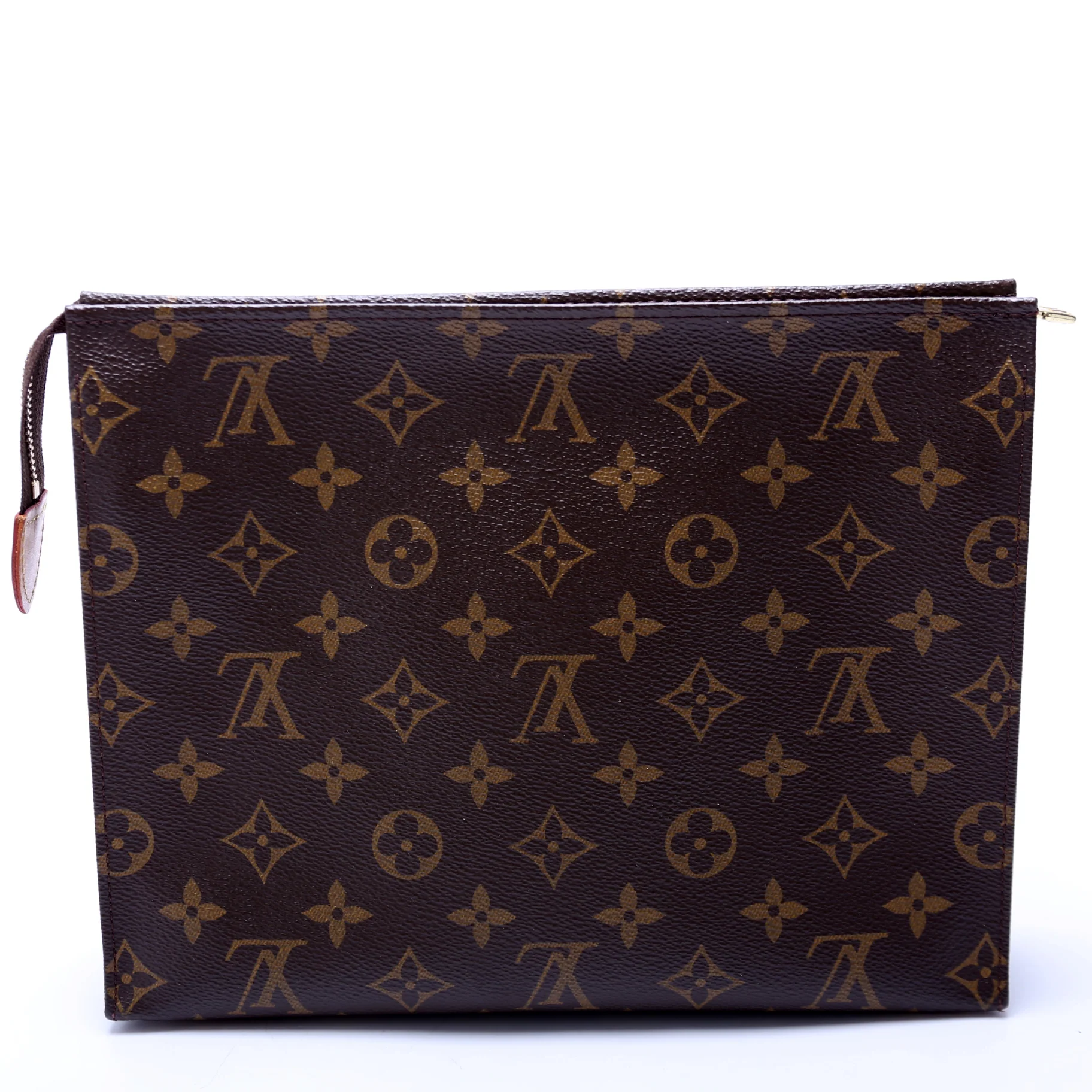 This pre-owned Louis Vuitton Toiletry Pouch 26 Newer is guaranteed 100% authentic. The exterior is in the classic Monogram coated canvas.