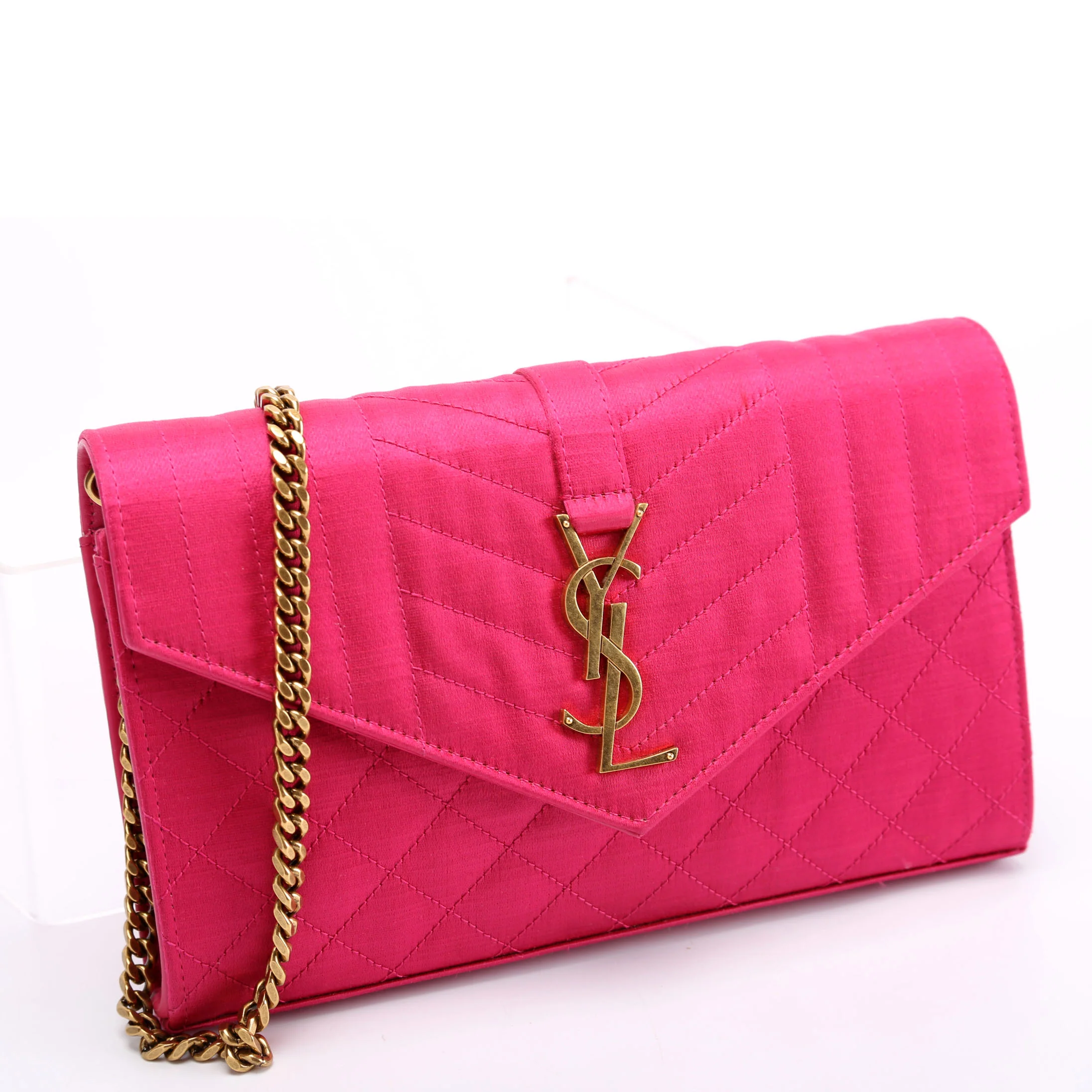 This pre-owned Saint Laurent Triquilt Satin Chain Wallet is guaranteed 100% authentic.